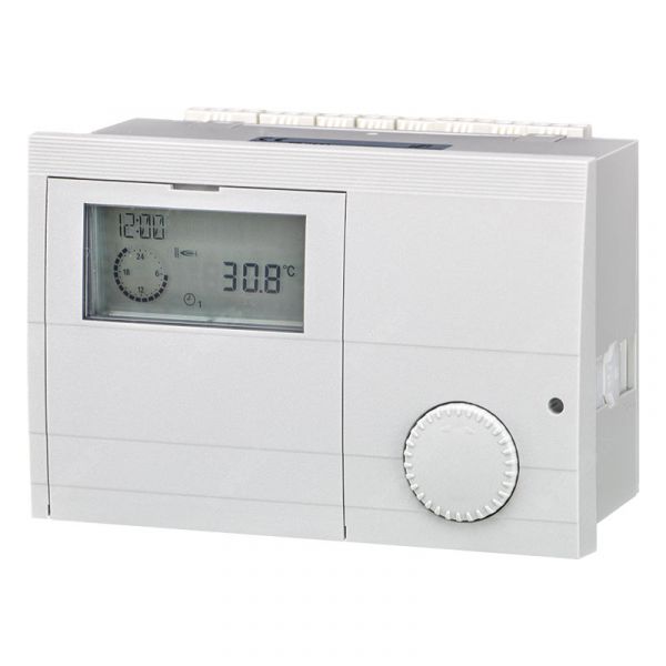 Der Elfatherm E8.0634 ist ein witterungs- und raumgeführter Heizungsregler für den Schaltfeldeinbau oder die Wandmontage (nur mit Wandaufbaugehäuse WAG1, optional). Er ist geeignet für Heizungsanlagen mit einem ein- oder zweistufigen Wärmeerzeuger oder zwei einstufigen Wärmeerzeugern, zwei gemischten Heizkreisen und einer Warmwasserbereitung. Für jeden Heizkreis kann eine eigene Betriebsart bzw. ein eigenes Zeitprogramm eingestellt werden. Der Regler verfügt über zwei Zusatzrelais, über die Sonderfunktionen gesteuert werden können (z.B. Solaranlage, Feststoffkessel, Zirkulationspumpe, Rücklaufanhebung, Sammlerpumpe, etc.). Die integrierte CAN-Bus-Schnittstelle ermöglicht die Erweiterung des Reglers um weitere Regelgeräte, Fernbedienungen und Computerschnittstellen. Das beleuchtete Display, die klar gegliederte Menüstruktur und die einfache Ein-Knopf-Bedienung ermöglichen eine übersichtliche und schnelle Parametrierung.